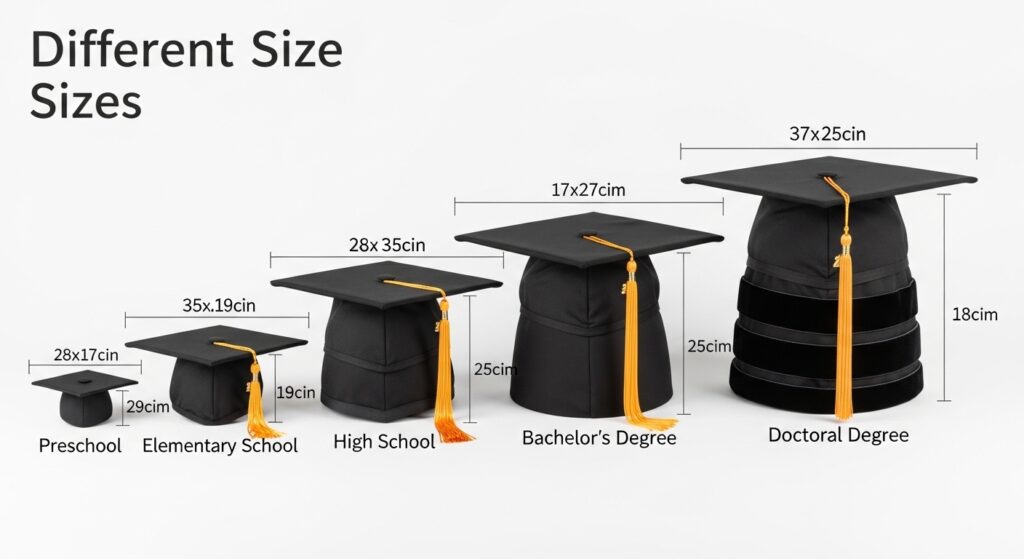 So, what size is a standard graduation cap? Roughly 9.4 inches square for most, with elastic bands spanning 22–25 inches, tassels measuring 9 inches, and boards about half an inch thick. Doctoral versions expand slightly, children’s versions shrink gently.