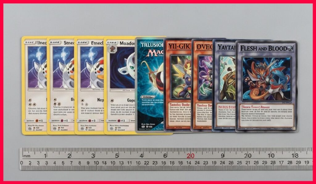 - Yu-Gi-Oh! cards: smaller, around 59 × 86 mm, almost like the younger sibling who never quite got the hand-me-down shirts to fit.
