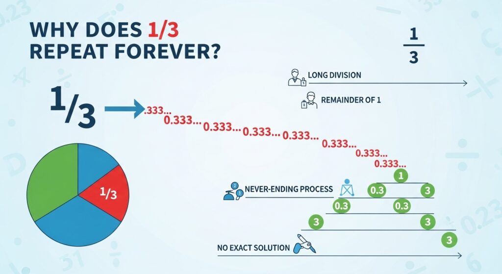 This article is about that strange magic trick. About what is 1/3 as a decimal, why it behaves the way it does, and why generations of students, parents, and even confident adults have stared at 0.333… and thought, wait, is that… finished? Or is it not.